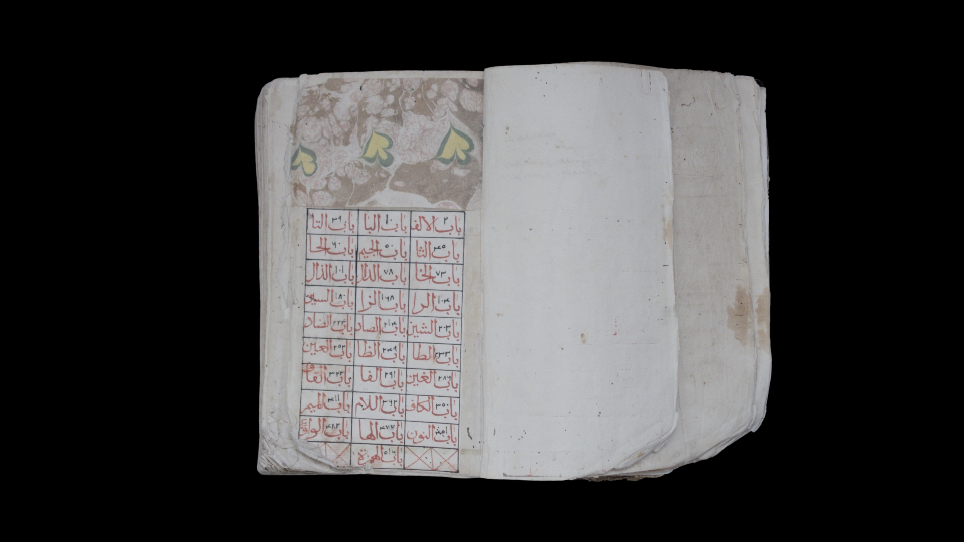Indice del dizionario manoscritto con inchiostro rosso per le lettere e nero per i numeri di pagina