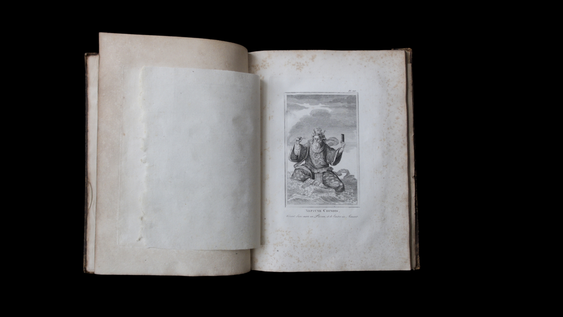 Esempio di foxing che circonda illustrazione raffigurante Nettuno cinese protetta da velina